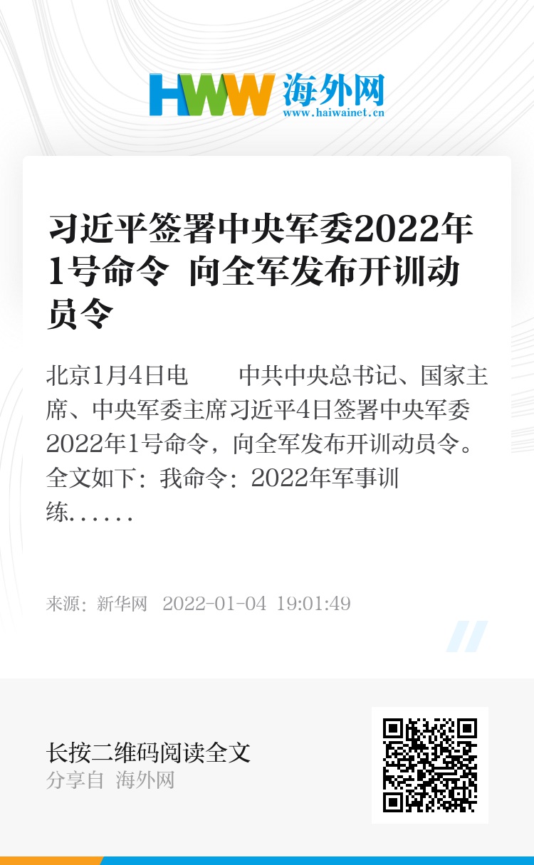 新华社北京1月4日电 中共中央总书记、国家主席、中央军委主席习近平4日签署中央军委2022年1号命令,向全军发布开训动员令。全文如下: