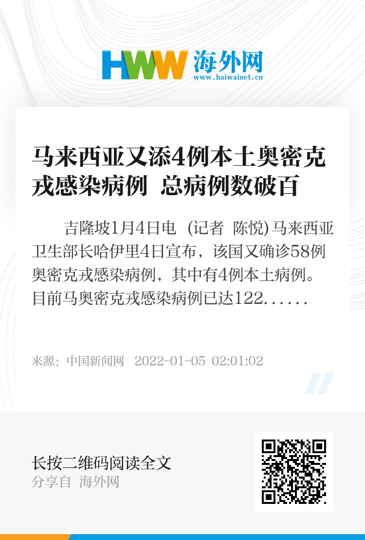 这4例本土病例都是同一境外输入病例的密切接触者。这例境外输入病例2021年12月12日抵达马来西亚,12月24日被确诊为奥密克戎感染病例;他的4位密切接触者12月17日即出现症状,12月19日确诊新冠肺炎,并在近期经过基因测序认定为奥密克戎感染病例。