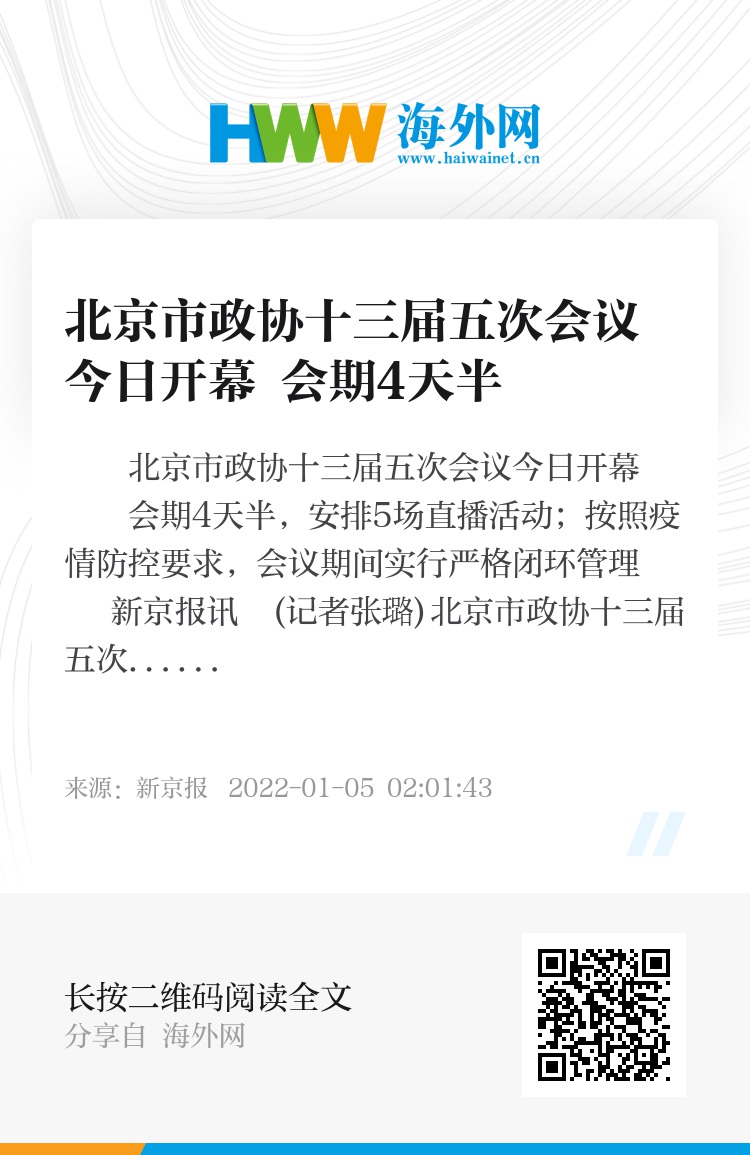 新京报讯 (记者张璐)北京市政协十三届五次会议将于2022年1月5日上午9点开幕,会期4天半。按照疫情防控要求,会议期间实行严格闭环管理。本次大会共安排4次全体会,分别是开幕会、大会发言、大会选举、闭幕会。