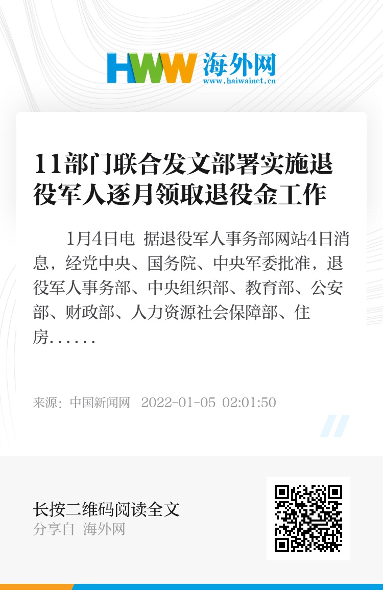 中新网1月4日电 据退役军人事务部网站4日消息,经党中央、国务院、中央军委批准,退役军人事务部、中央组织部、教育部、公安部、财政部、人力资源社会保障部、住房和城乡建设部、国家税务总局、国家医疗保障局、中央军委政治工作部、中央军委后勤保障部等11个部门日前联合印发《退役军人逐月领取退役金安置办法》(以下简称《办法》),自2021年12月24日起施行。