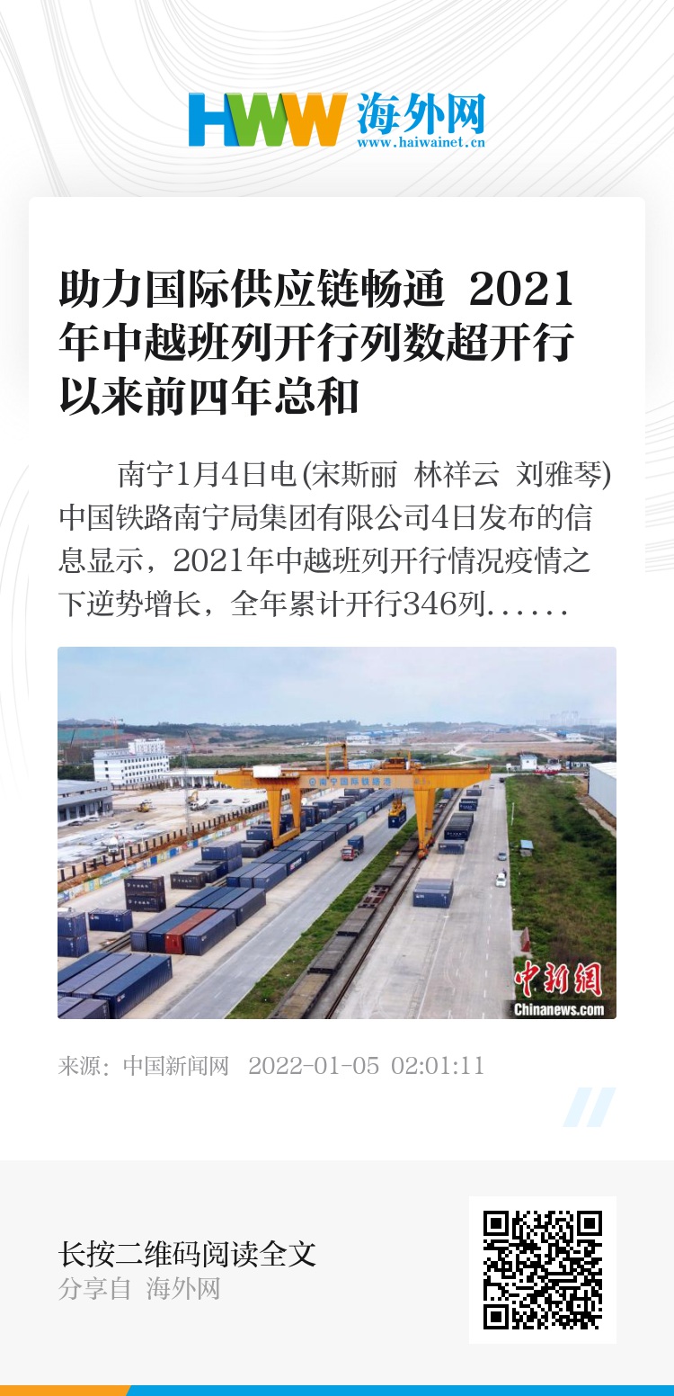 中新网南宁1月4日电(宋斯丽 林祥云 刘雅琴)中国铁路南宁局集团有限公司4日发布的信息显示,2021年中越班列开行情况疫情之下逆势增长,全年累计开行346列,同比增长108.4%,超开行以来前四年总和,创南宁局集团公司跨境班列开行数量新高。