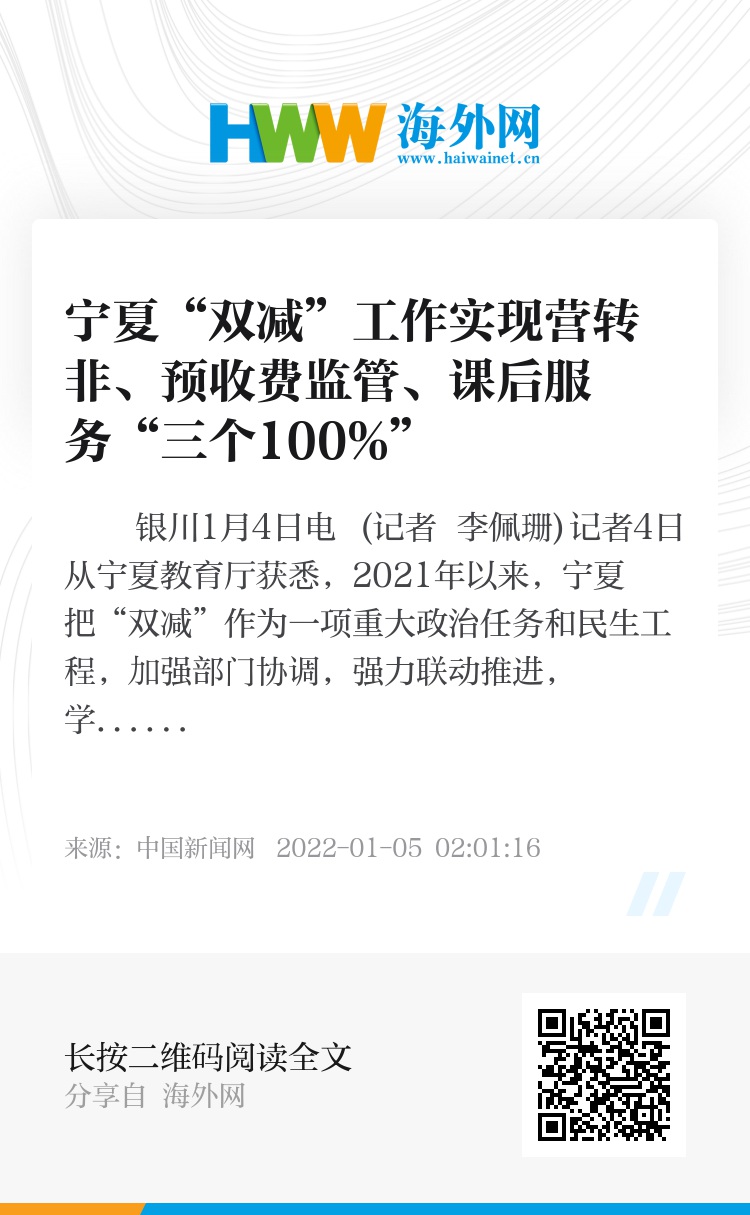中新网银川1月4日电 (记者 李佩珊)记者4日从宁夏教育厅获悉,2021年以来,宁夏把“双减”作为一项重大政治任务和民生工程,加强部门协调,强力联动推进,学科类校外培训机构大幅压减,课后服务全面开展。目前,宁夏已实现“营转非”、预收费监管、课后服务“三个100%”,如期完成年度各项任务。