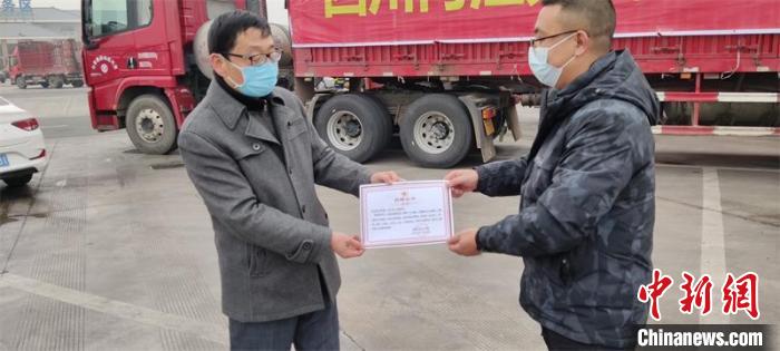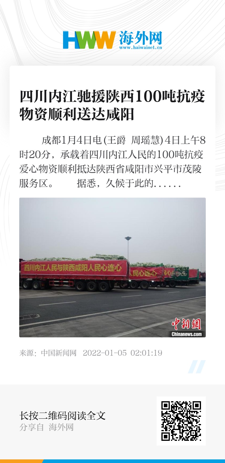 中新网成都1月4日电(王爵 周瑶慧)4日上午8时20分,承载着四川内江人民的100吨抗疫爱心物资顺利抵达陕西省咸阳市兴平市茂陵服务区。