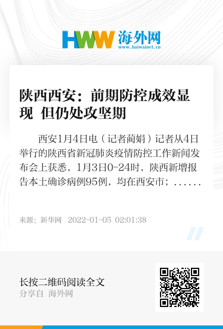 新华社西安1月4日电(记者蔺娟)记者从4日举行的陕西省新冠肺炎疫情防控工作新闻发布会上获悉,1月3日0-24时,陕西新增报告本土确诊病例95例,均在西安市;疫情总的趋势呈现下降态势,前期防控成效显现,但仍处于防控工作的攻坚期。西安市重点区域、重点人群疫情防控仍需要进一步加强。