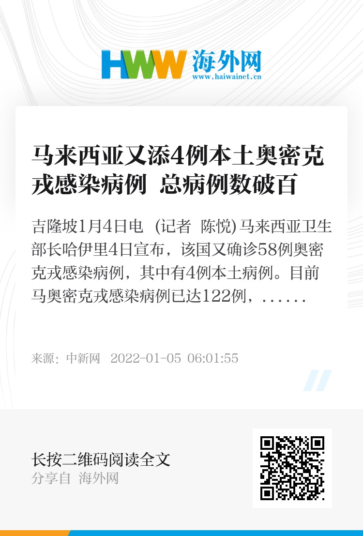 这4例本土病例都是同一境外输入病例的密切接触者。这例境外输入病例2021年12月12日抵达马来西亚,12月24日被确诊为奥密克戎感染病例;他的4位密切接触者12月17日即出现症状,12月19日确诊新冠肺炎,并在近期经过基因测序认定为奥密克戎感染病例。