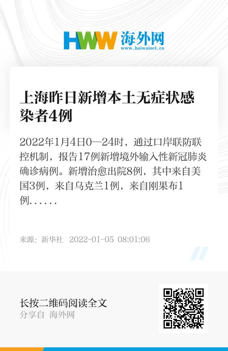 2022年1月4日0—24时,通过口岸联防联控机制,报告17例新增境外输入性新冠肺炎确诊病例。新增治愈出院8例,其中来自美国3例,来自乌克兰1例,来自刚果布1例,来自英国1例,来自巴布亚新几内亚1例,来自匈牙利1例。