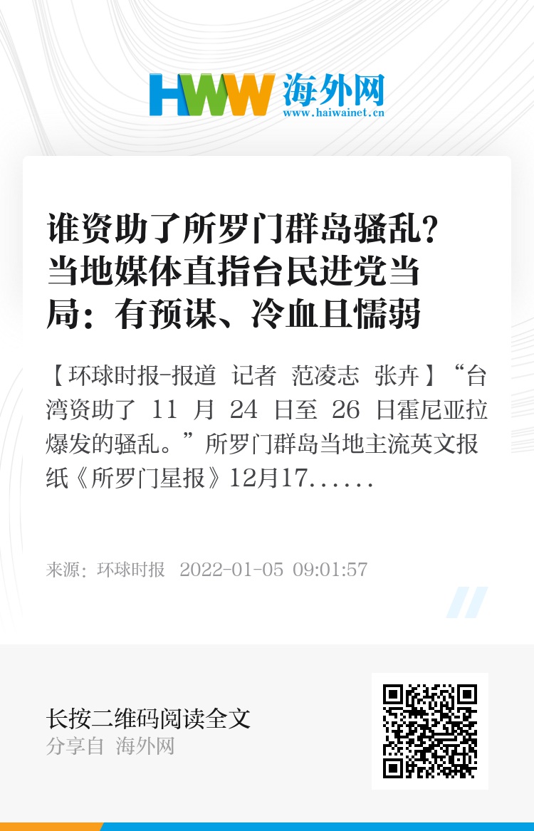 【环球时报-环球网报道 记者 范凌志 张卉】“台湾资助了 11 月 24 日至 26 日霍尼亚拉爆发的骚乱。”所罗门群岛当地主流英文报纸《所罗门星报》12月17日引述署名为乔治·贝劳(George Belau)的文章,直斥台湾民进党当局在霍尼亚拉制造破坏的行为是“有预谋的、冷血的”,台湾(民进党当局)及其支持骚乱势力不仅是中国的敌人,更是所罗门群岛的敌人。文章在最后向所罗门群岛人民发问:“中国从未侵略别国,从不输出价值观和政治制度,是世界上唯一代表发展而不是破坏的国家。所有马莱塔人和所罗门人,你们希望选谁作朋友?”
