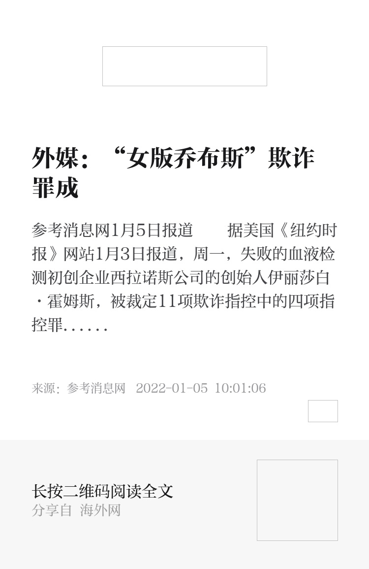 另据新加坡《联合早报》网站1月4日报道,被誉为“女版乔布斯”的霍姆斯现年37岁,在2003年创建了西拉诺斯,该公司的估值一度达到90亿美元。