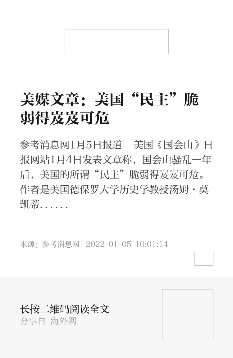 参考消息网1月5日报道 美国《国会山》日报网站1月4日发表文章称,国会山骚乱一年后,美国的所谓“民主”脆弱得岌岌可危。作者是美国德保罗大学历史学教授汤姆·莫凯蒂斯。全文摘编如下: