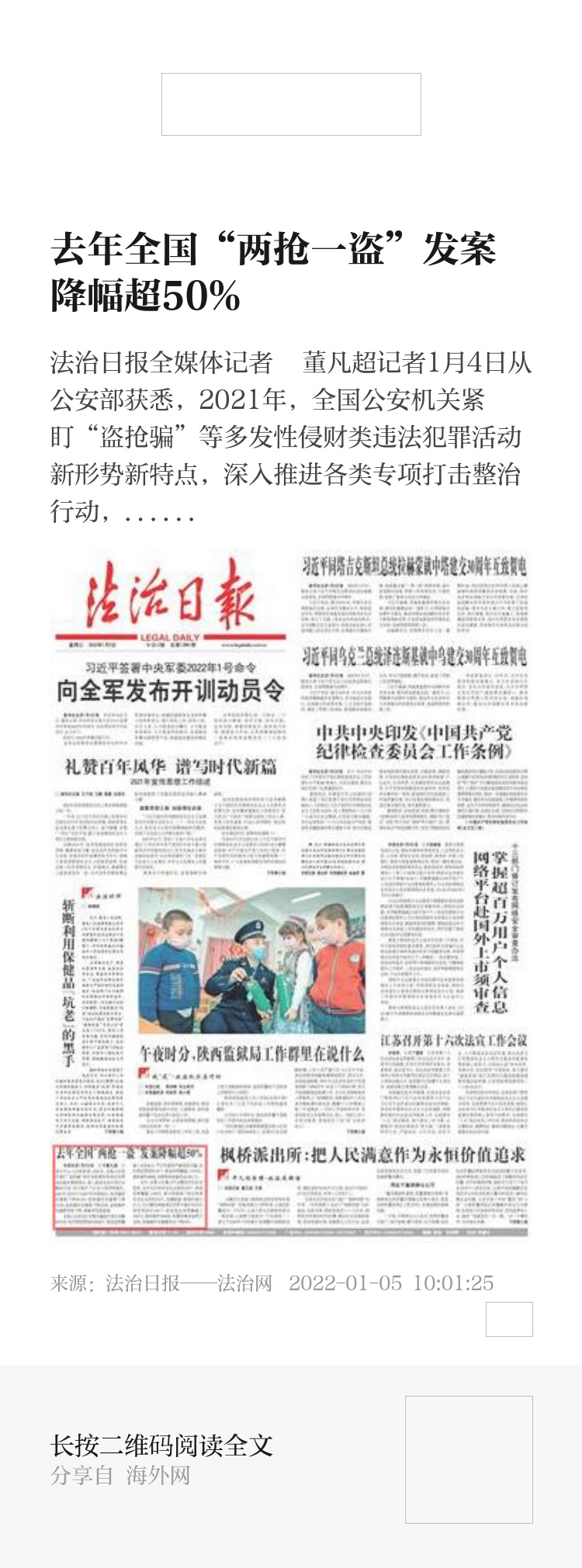 记者1月4日从公安部获悉,2021年,全国公安机关紧盯“盗抢骗”等多发性侵财类违法犯罪活动新形势新特点,深入推进各类专项打击整治行动,有力维护了社会大局持续稳定。2021年1至10月与2017年同期相比,抢夺案件发案数下降89.8%,抢劫案件发案数下降75.5%,盗窃案件发案数下降53.3%,盗抢案件发案数持续下降、破案率明显提高。