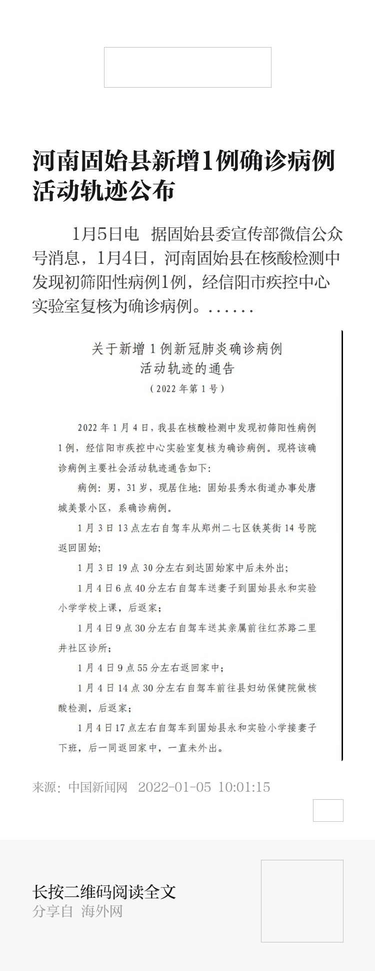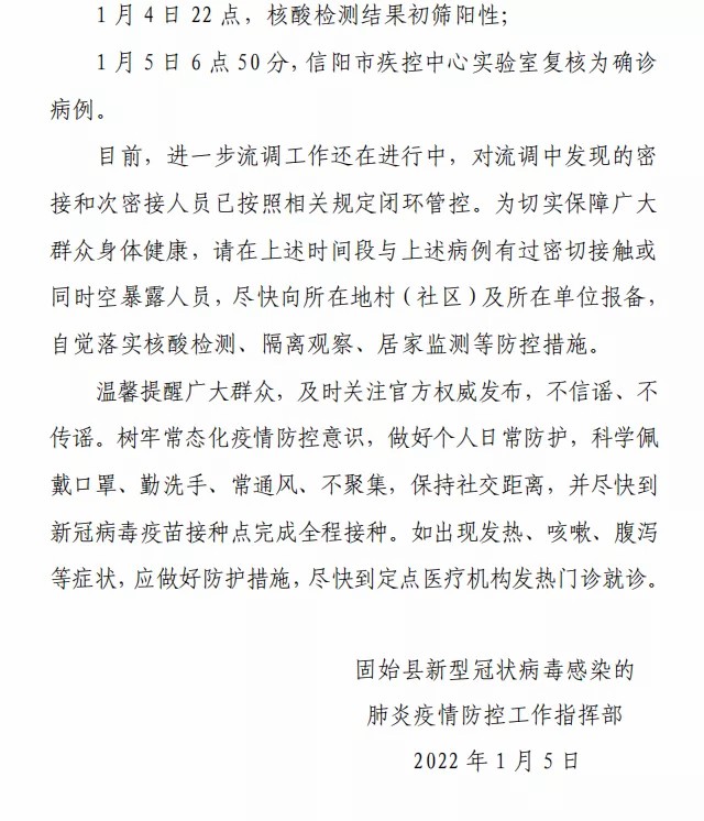 中新网1月5日电 据固始县委宣传部微信公众号消息,1月4日,河南固始县在核酸检测中发现初筛阳性病例1例,经信阳市疾控中心实验室复核为确诊病例。