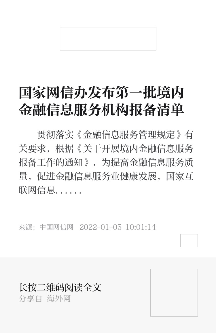 贯彻落实《金融信息服务管理规定》有关要求,根据《关于开展境内金融信息服务报备工作的通知》,为提高金融信息服务质量,促进金融信息服务业健康发展,国家互联网信息办公室组织开展境内金融信息服务报备工作。现公开发布第一批20家金融信息服务机构的名称及报备编号。