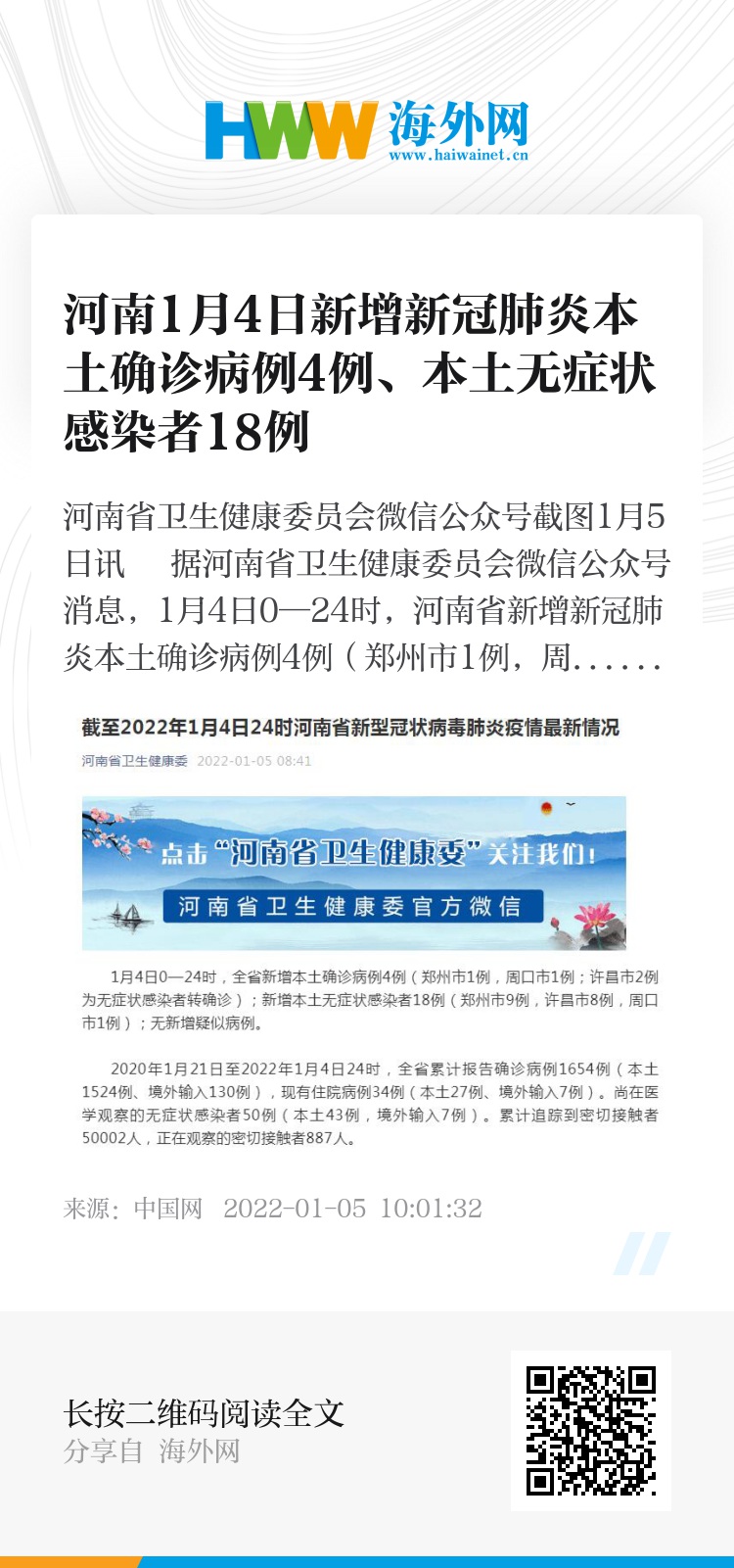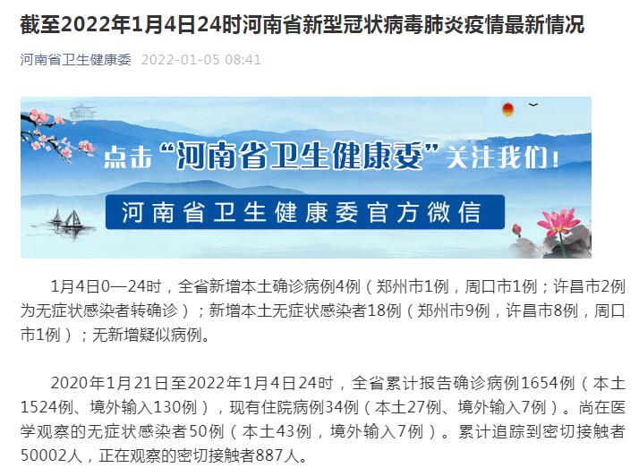 2020年1月21日至2022年1月4日24时,河南省累计报告确诊病例1654例(本土1524例、境外输入130例),现有住院病例34例(本土27例、境外输入7例)。尚在医学观察的无症状感染者50例(本土43例,境外输入7例)。累计追踪到密切接触者50002人,正在观察的密切接触者887人。