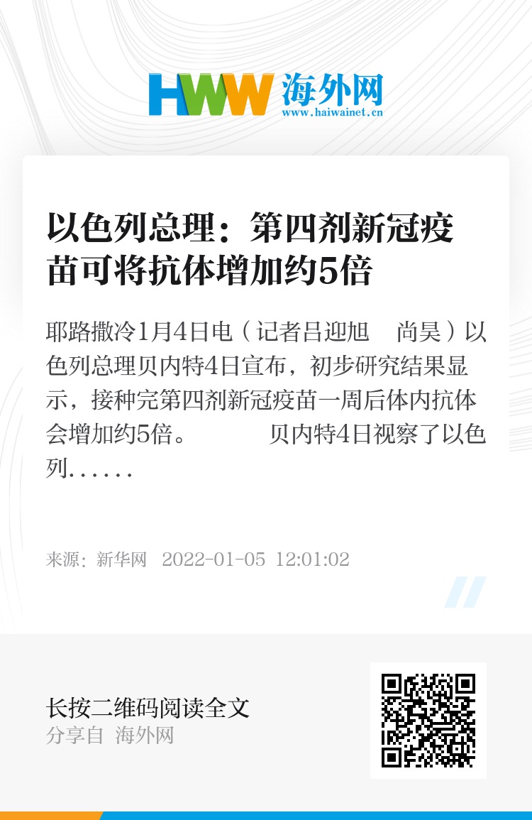 新华社耶路撒冷1月4日电(记者吕迎旭 尚昊)以色列总理贝内特4日宣布,初步研究结果显示,接种完第四剂新冠疫苗一周后体内抗体会增加约5倍。