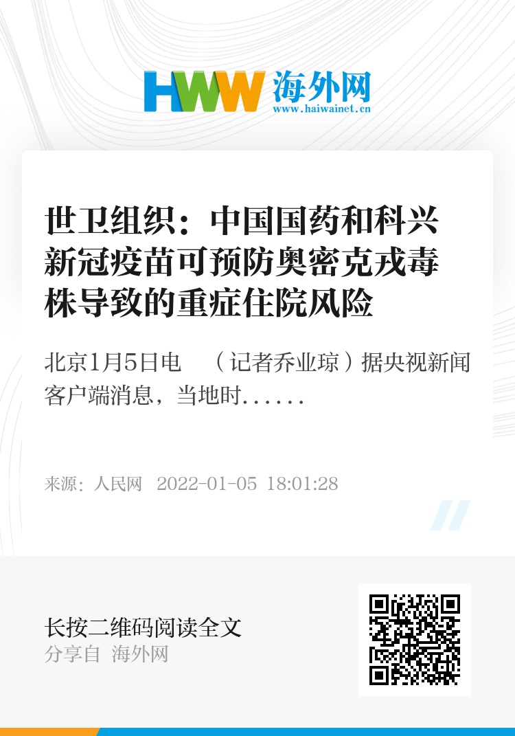 人民网北京1月5日电 (记者乔业琼)据央视新闻客户端消息,当地时间4日,世卫组织官员阿卜迪・马哈茂德表示,研究表明,中国国药和科兴等新冠疫苗可预防奥密克戎毒株导致的重症住院风险,预计疫苗对重症住院患者的保护力将继续维持。