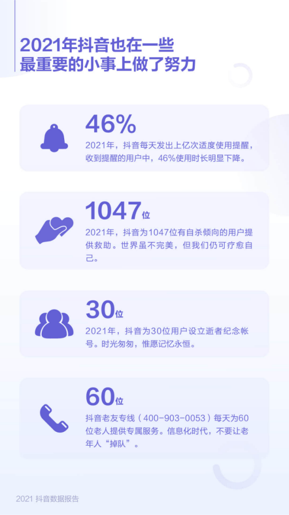 此外,过去一年,抖音还为1047位有自杀倾向的用户提供救助,也为30位用户设立逝者纪念帐号。