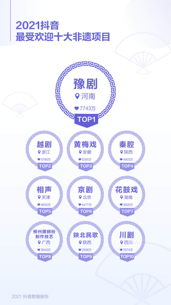 过去一年,抖音最受欢迎十大非遗项目分别是豫剧、越剧、黄梅戏、秦腔、相声、京剧、花鼓戏、柳州螺蛳粉制作技艺、陕北民歌、川剧。其中,豫剧获赞7743万,越剧获赞5789万、黄梅戏获赞5305万。