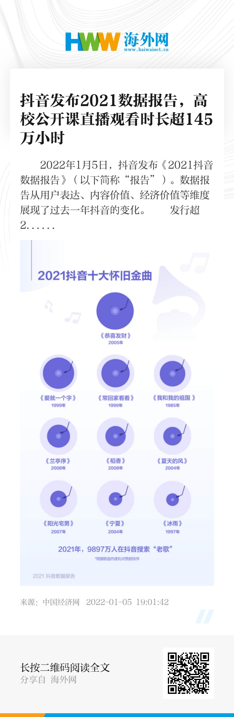2021年,有9897万人在抖音搜索老歌。也有越来越多华语金曲通过抖音重新翻红,其中部分歌曲发行时间已经超过了20年。
