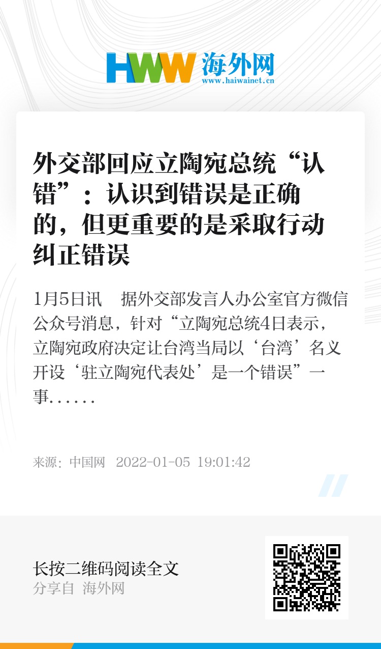 中国网1月5日讯 据外交部发言人办公室官方微信公众号消息,针对“立陶宛总统4日表示,立陶宛政府决定让台湾当局以‘台湾’名义开设‘驻立陶宛代表处’是一个错误”一事,中国外交部发言人汪文斌在今日举行的例行记者会上回应:认识到错误是正确的一步,但更重要的是采取行动纠正制造“一中一台”的错误行径,回到一个中国原则的轨道上来。