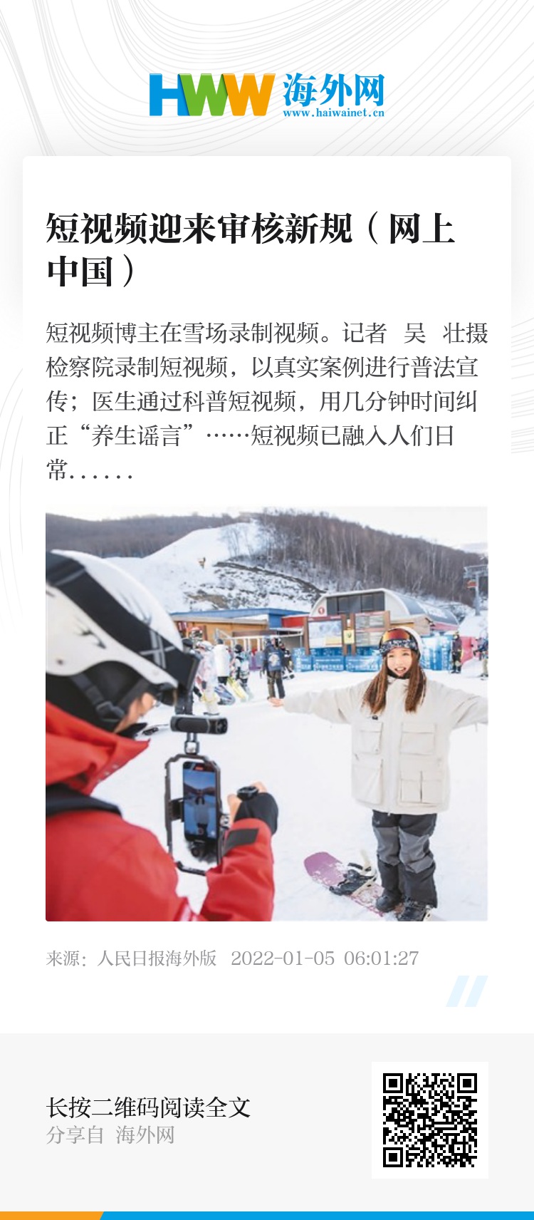 短视频博主在雪场录制视频。