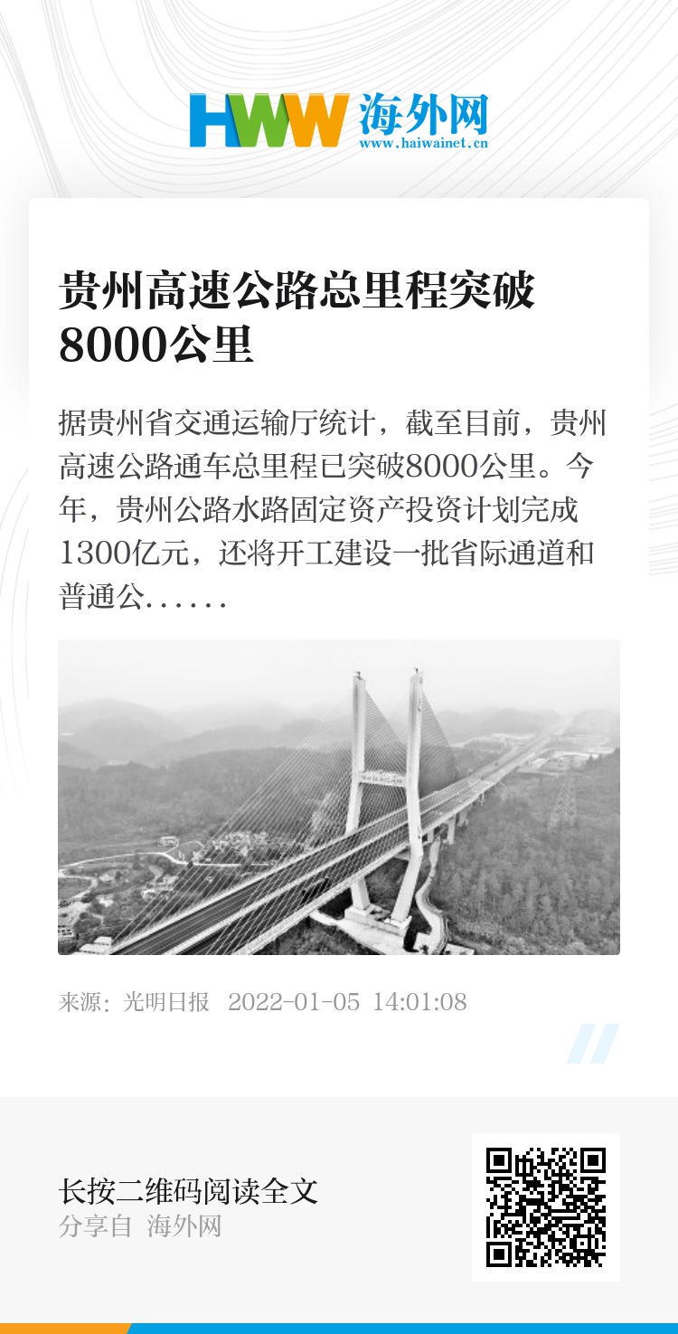 据贵州省交通运输厅统计,截至目前,贵州高速公路通车总里程已突破8000公里。今年,贵州公路水路固定资产投资计划完成1300亿元,还将开工建设一批省际通道和普通公路项目。图为1月3日拍摄的遵义市兰海高速贵遵复线楠木渡乌江大桥。罗星汉摄/光明图片