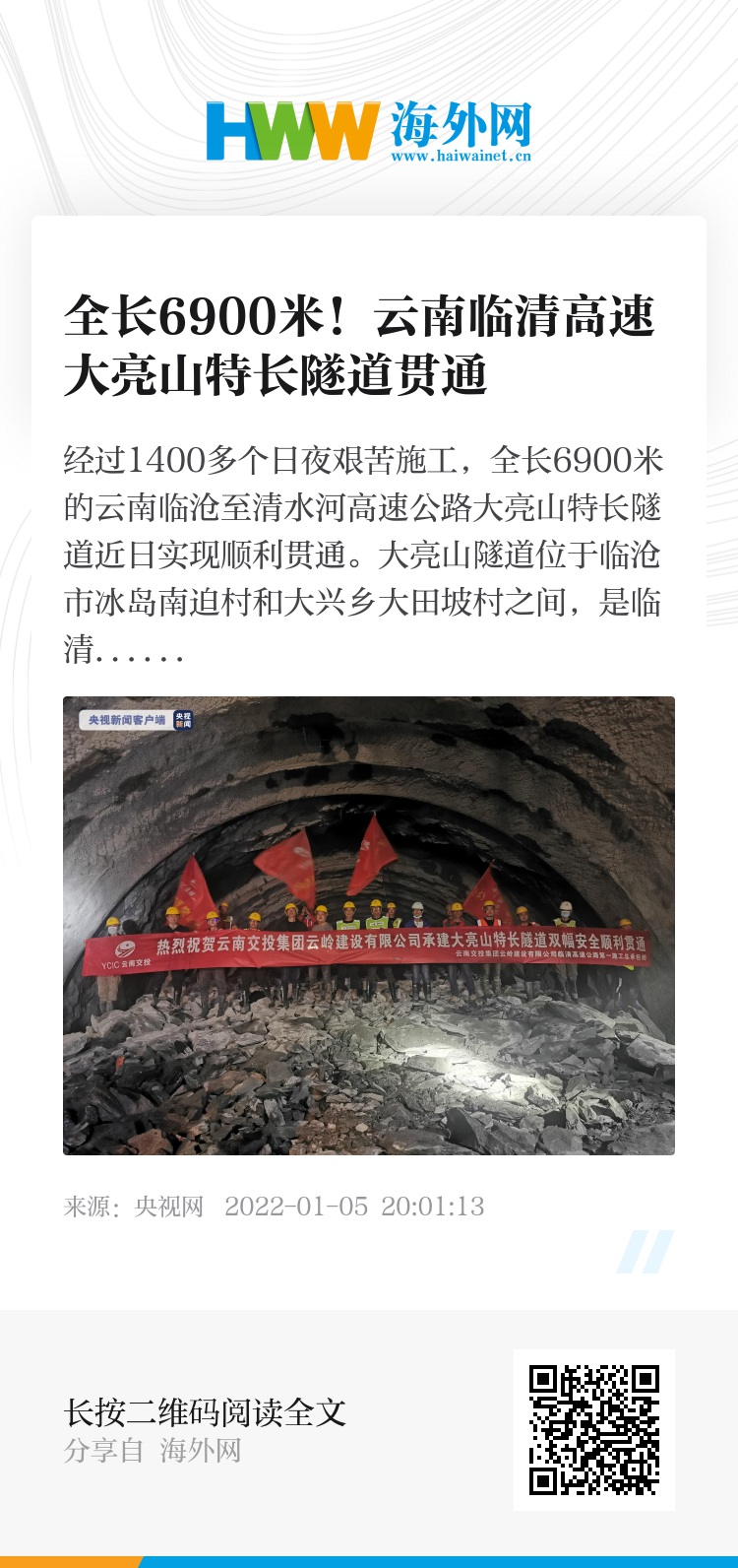 经过1400多个日夜艰苦施工,全长6900米的云南临沧至清水河高速公路大亮山特长隧道近日实现顺利贯通。