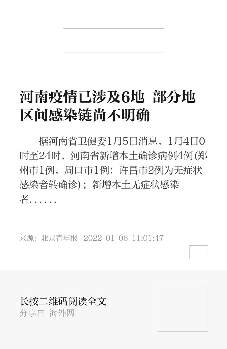 据河南省卫健委1月5日消息,1月4日0时至24时,河南省新增本土确诊病例4例(郑州市1例,周口市1例;许昌市2例为无症状感染者转确诊);新增本土无症状感染者18例(郑州市9例,许昌市8例,周口市1例)。此外,5日,商丘市睢阳区新增1例无症状感染者,系郑州市二七区一例初筛阳性人员同餐厅就餐的密切接触者,信阳固始县新增1例确诊病例和1例无症状感染者,两人均为1月3日由郑州市二七区返回固始县。加上此前已发现多例感染者的洛阳市新安县,至此,河南省本轮疫情已涉及6地。