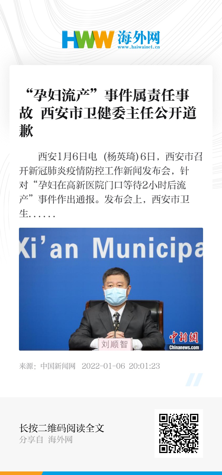 中新网西安1月6日电 (杨英琦)6日,西安市召开新冠肺炎疫情防控工作新闻发布会,针对“孕妇在高新医院门口等待2小时后流产”事件作出通报。发布会上,西安市卫生健康委主任刘顺智公开道歉。