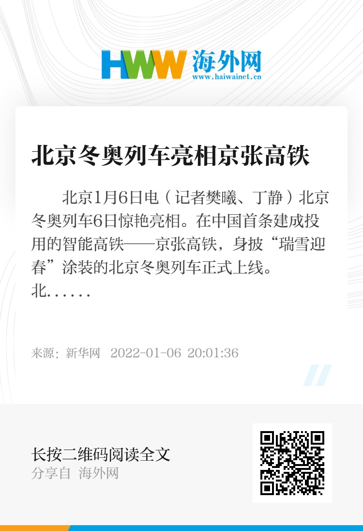 新华社北京1月6日电(记者樊曦、丁静)北京冬奥列车6日惊艳亮相。在中国首条建成投用的智能高铁——京张高铁,身披“瑞雪迎春”涂装的北京冬奥列车正式上线。