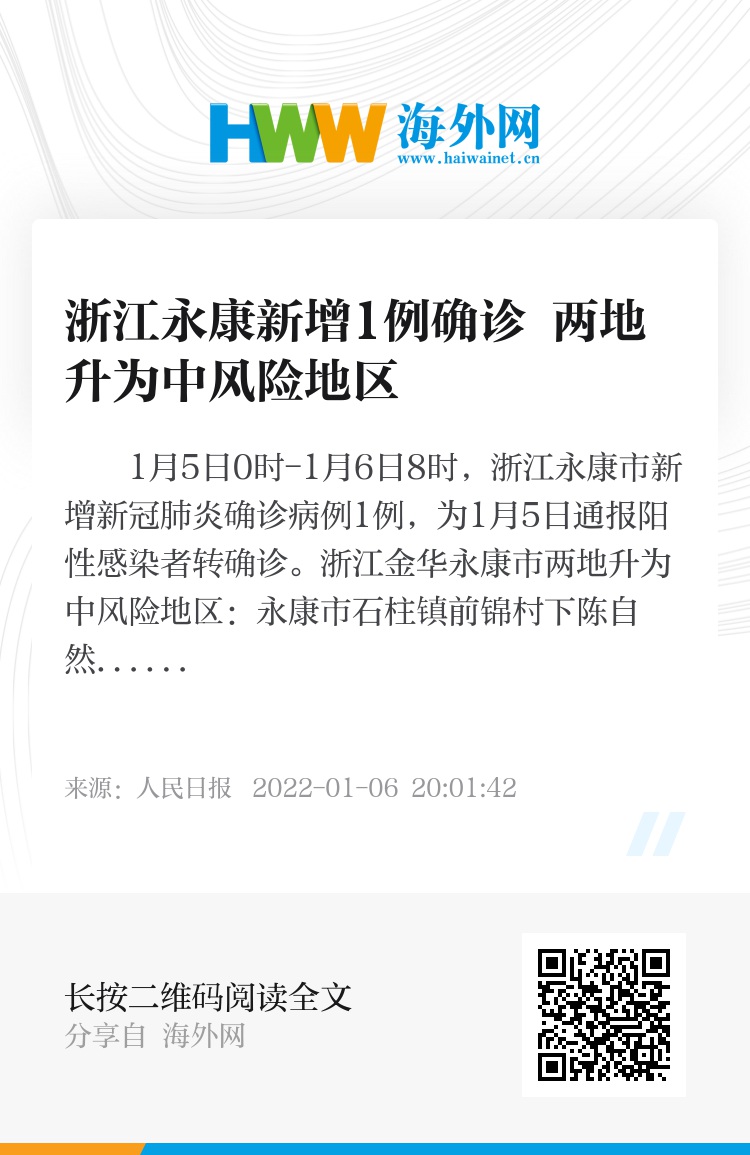 1月5日0时-1月6日8时,浙江永康市新增新冠肺炎确诊病例1例,为1月5日通报阳性感染者转确诊。浙江金华永康市两地升为中风险地区:永康市石柱镇前锦村下陈自然村、永康市增杰衡器厂。