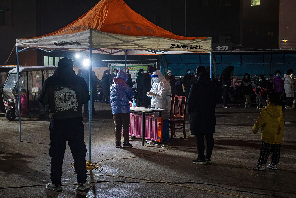 2022年1月5日,河南省郑州市,二七区一小区市民排队等待核酸检测。当日,郑州市新冠肺疫情防控指挥部办公室发布通告(2022年3号),1月5日至6日,分时段、分区域错峰,在郑州市域开展全员核酸检测。图源:人民视觉