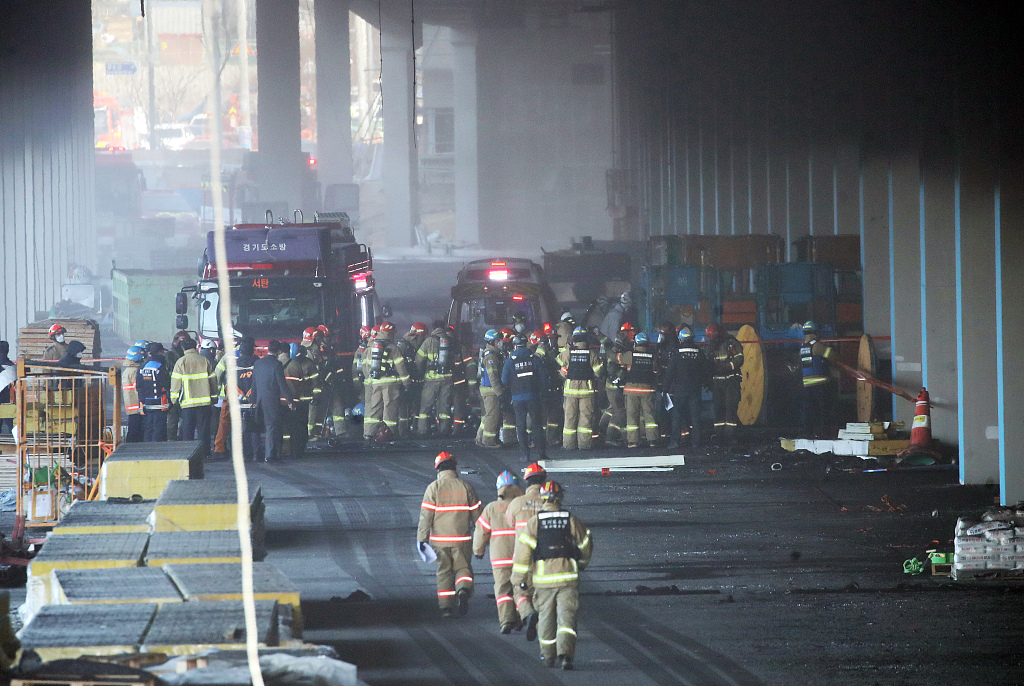 当地时间2022年1月6日,韩国京畿道平泽市某冷冻仓库发生火灾,消防员们正在灭火。图源:视觉中国