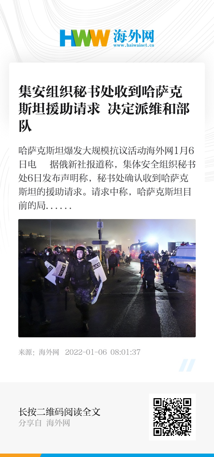 现任集安组织安全理事会主席、亚美尼亚总理帕希尼扬6日也在社交媒体上表示,鉴于外部干涉等因素已对哈萨克斯坦国家安全和主权构成威胁,维和部队将会在限定期限内派驻哈萨克斯坦以稳定局势。