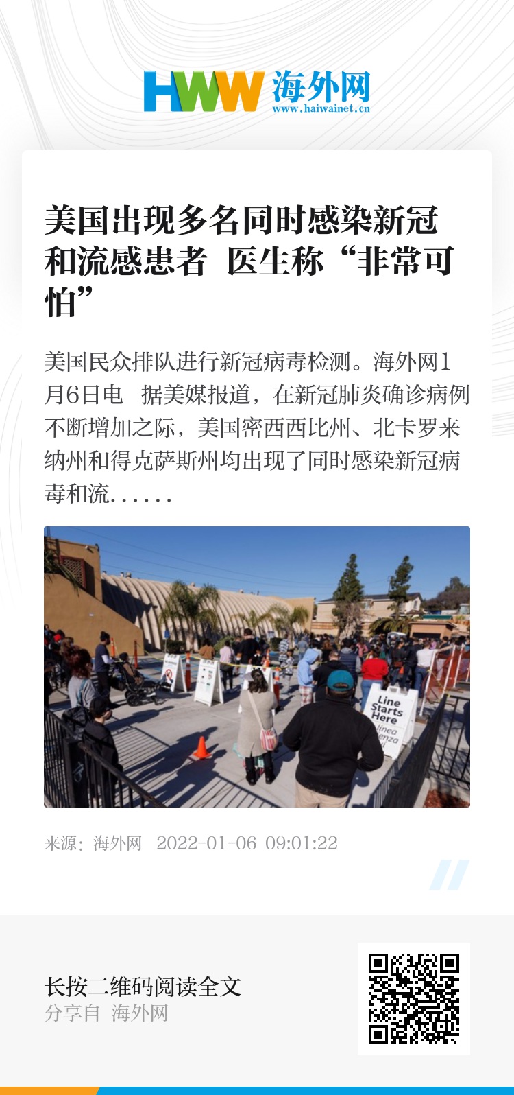 海外网1月6日电 据美媒报道,在新冠肺炎确诊病例不断增加之际,美国密西西比州、北卡罗来纳州和得克萨斯州均出现了同时感染新冠病毒和流感病毒的患者。这一新情况让一些医生感到“非常可怕”。