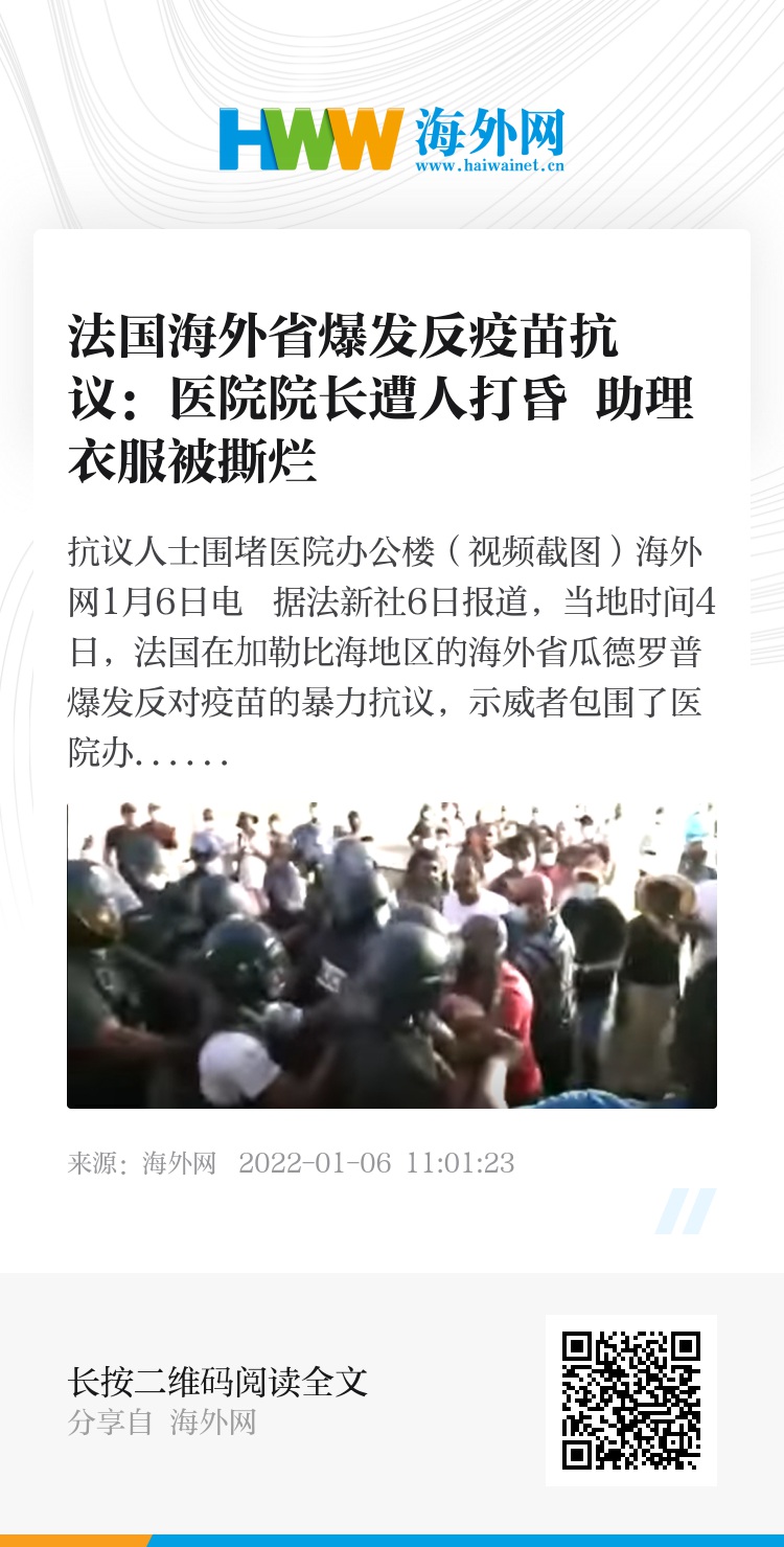 据报道,瓜德罗普抗议人士4日包围大学医院办公楼,反对要求卫生工作者接种新冠疫苗的法规。抗议现场十分混乱,医院院长杰拉德·科泰隆回忆称,自己的头部和肋骨被锤,中间有10秒丧失意识,随后警察赶来护送其撤离。科泰隆的两名助理也在现场,其中一人的衬衫被撕烂,在赶往警车的途中还被浇水。