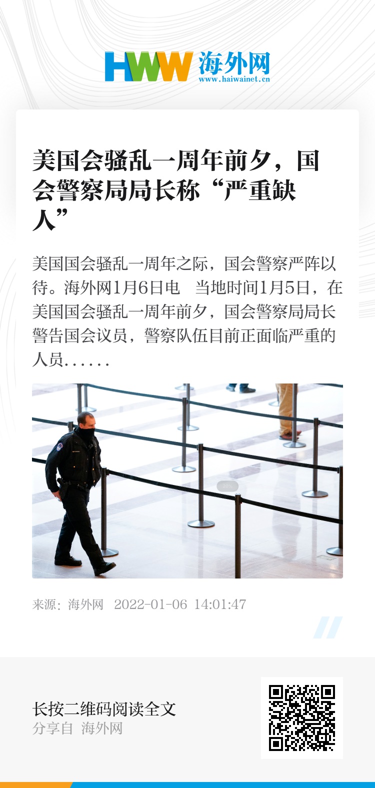 海外网1月6日电 当地时间1月5日,在美国国会骚乱一周年前夕,国会警察局局长警告国会议员,警察队伍目前正面临严重的人员短缺问题,还需要约450名警察。