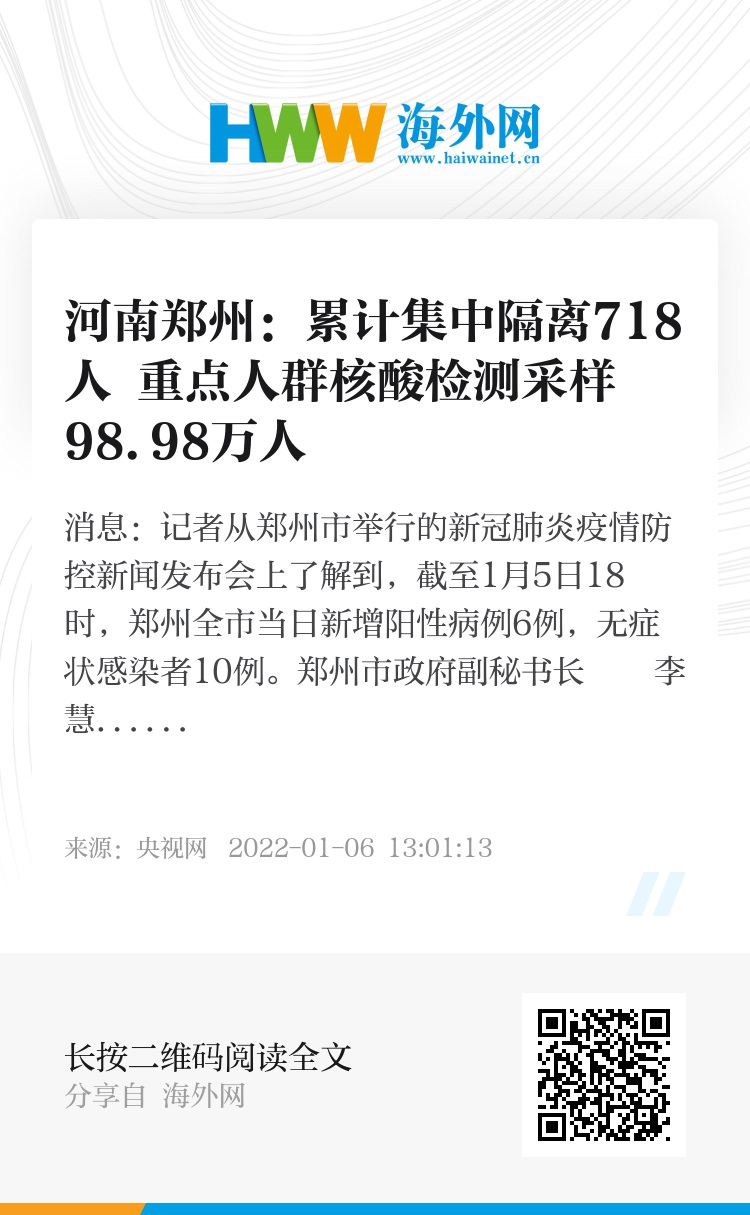 郑州市政府副秘书长 李慧芳:截至目前,管城、二七、中原、金水4区重点区域、重点人群核酸检测采样98.98万人,已全部检测完毕,共检出阳性病例6例。