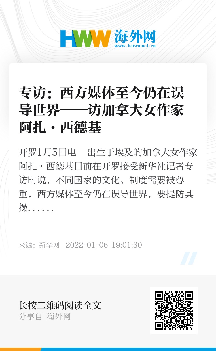 新华社开罗1月5日电 出生于埃及的加拿大女作家阿扎·西德基日前在开罗接受新华社记者专访时说,不同国家的文化、制度需要被尊重,西方媒体至今仍在误导世界,要提防其操纵与煽动。
