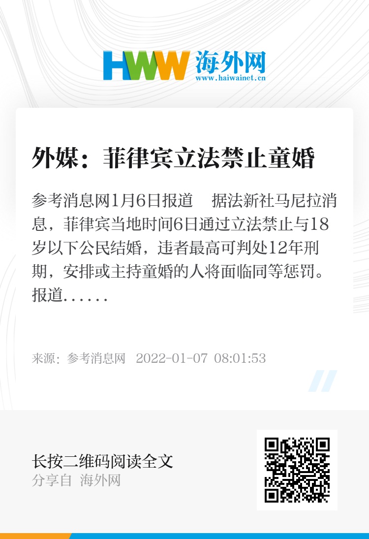 参考消息网1月6日报道 据法新社马尼拉消息,菲律宾当地时间6日通过立法禁止与18岁以下公民结婚,违者最高可判处12年刑期,安排或主持童婚的人将面临同等惩罚。