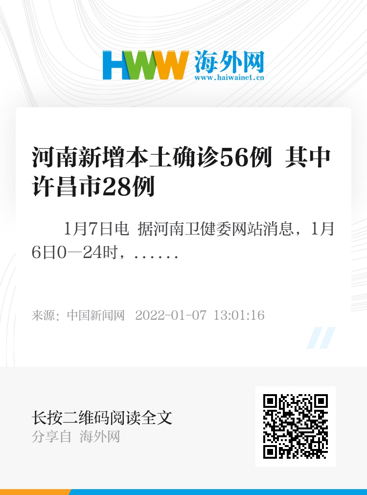 中新网1月7日电 据河南卫健委网站消息,1月6日0―24时,河南全省新增本土确诊56例(郑州市26例,洛阳市1例,许昌市28例,信阳市1例;含20例无症状感染者转确诊病例,其中郑州市15例,许昌市3例,洛阳市1例,信阳市1例);新增境外输入无症状感染者转确诊病例2例;新增境外输入无症状感染者1例;无新增疑似病例;1例本土确诊病例治愈出院;1例境外输入无症状感染者解除医学观察。