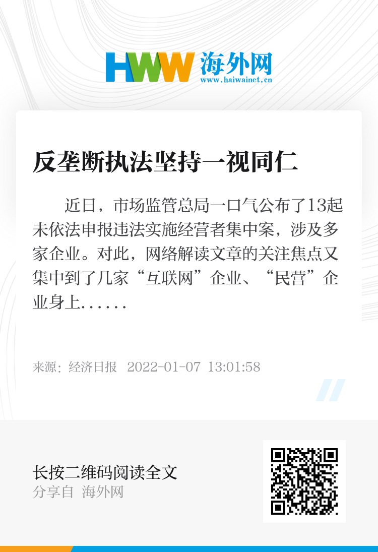 近日,市场监管总局一口气公布了13起未依法申报违法实施经营者集中案,涉及多家企业。对此,网络解读文章的关注焦点又集中到了几家“互联网”企业、“民营”企业身上。这种刻意聚焦是对反垄断执法的误读,偏离了保护市场公平竞争和维护消费者利益的本意。