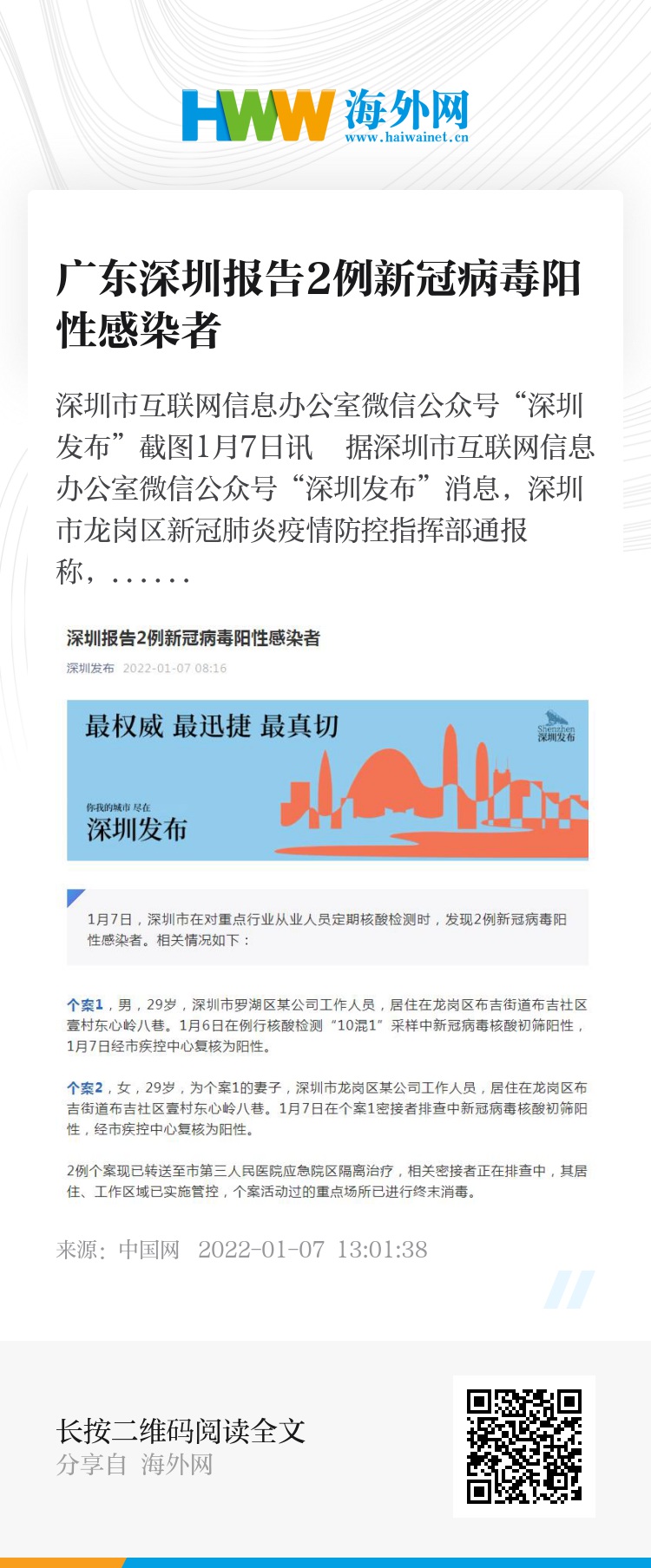 中国网1月7日讯 据深圳市互联网信息办公室微信公众号“深圳发布”消息,深圳市龙岗区新冠肺炎疫情防控指挥部通报称,1月7日,深圳市在对重点行业从业人员定期核酸检测时,发现2例新冠病毒阳性感染者。