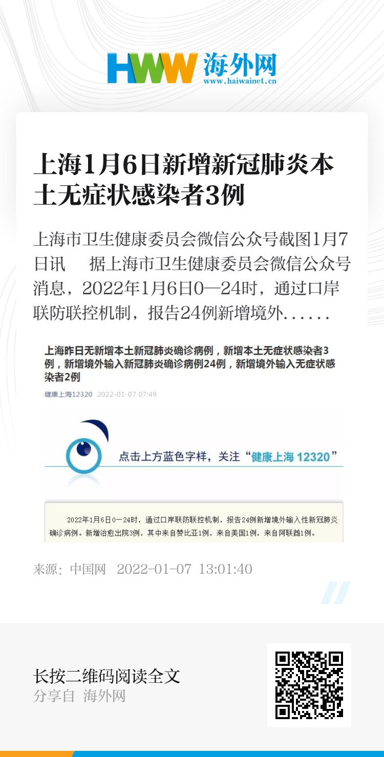2022年1月6日0—24时,新增本土无症状感染者3例。
