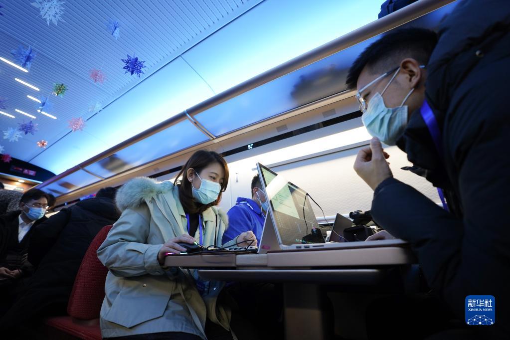 1月6日,北京冬奥列车亮相京张高铁。据介绍,北京冬奥列车全部使用时速350公里复兴号动车组开行,并配备5G超高清演播室。冬奥列车编组8辆,定员564人,外观采用“瑞雪迎春”涂装方案,彰显冬奥主题。北京冬奥列车将在1月21日至3月16日的冬奥运输期间开行,每日安排开行40对运输方案,其中基本方案17对,每日开行;预备方案23对,视需开行。新华社记者 鞠焕宗 摄