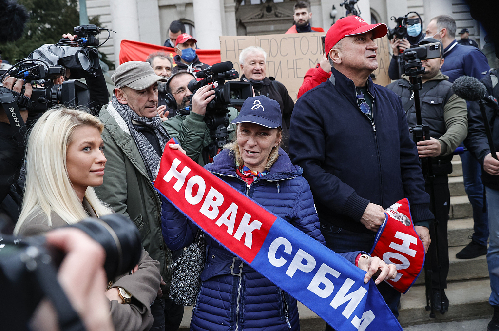 2022年1月7日讯,塞尔维亚网球名将德约科维奇入境澳大利亚被扣留,其父亲与球迷在家乡集会抗议。图片来源:视觉中国