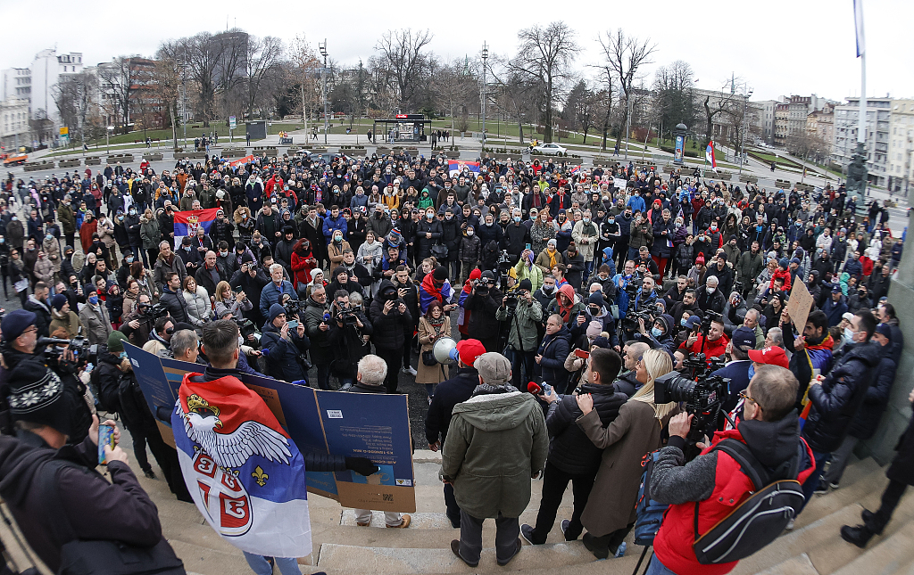 2022年1月7日讯,塞尔维亚网球名将德约科维奇入境澳大利亚被扣留,其父亲与球迷在家乡集会抗议。图片来源:视觉中国