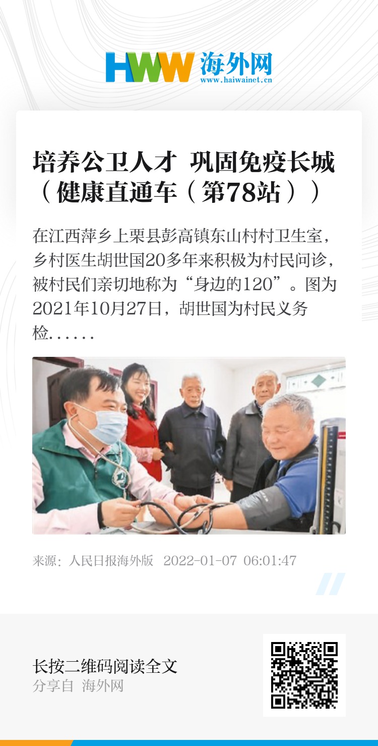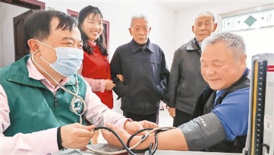 在江西萍乡上栗县彭高镇东山村村卫生室,乡村医生胡世国20多年来积极为村民问诊,被村民们亲切地称为“身边的120”。图为2021年10月27日,胡世国为村民义务检查身体。