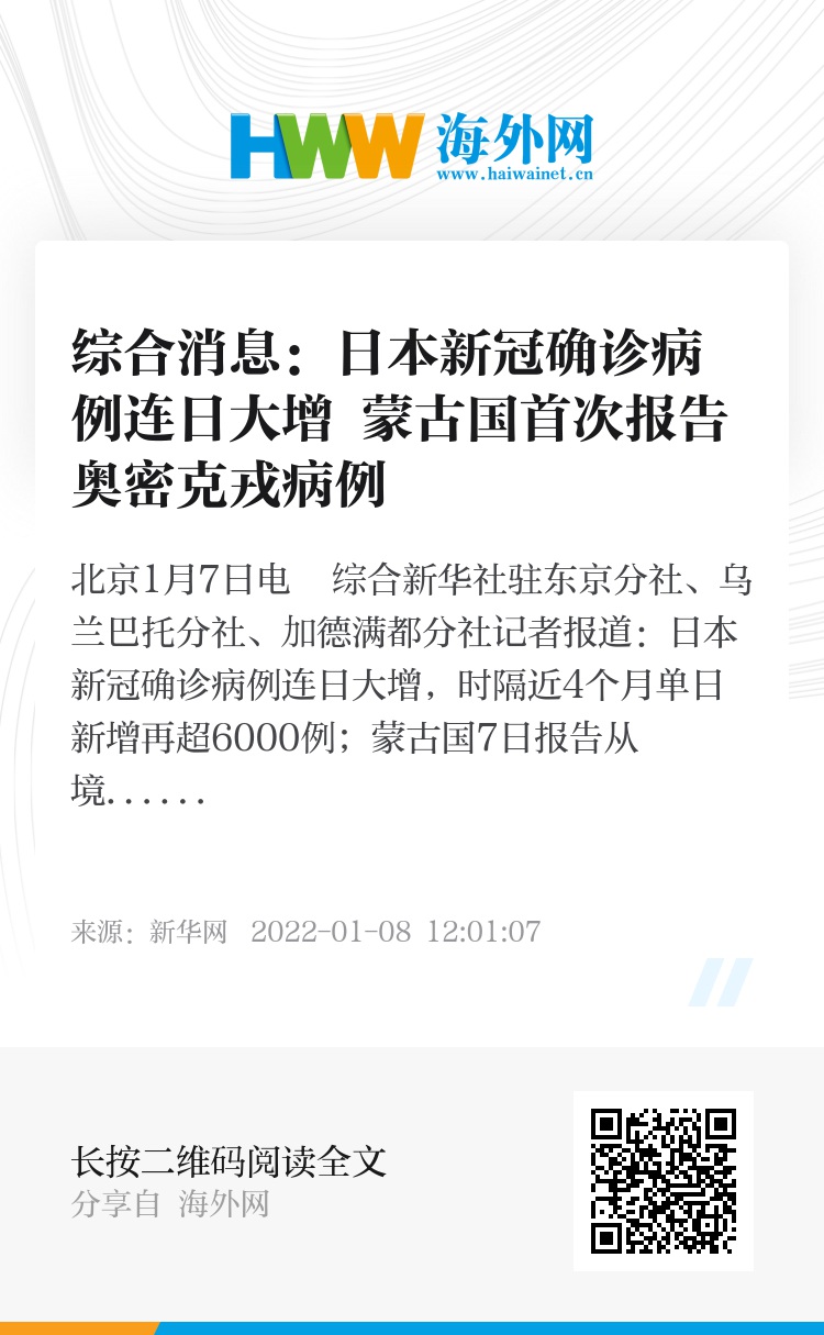 新华社北京1月7日电 综合新华社驻东京分社、乌兰巴托分社、加德满都分社记者报道:日本新冠确诊病例连日大增,时隔近4个月单日新增再超6000例;蒙古国7日报告从境外回国人员中检测出12例变异新冠病毒奥密克戎毒株感染病例;尼泊尔当天也确认新增24例奥密克戎毒株感染病例。