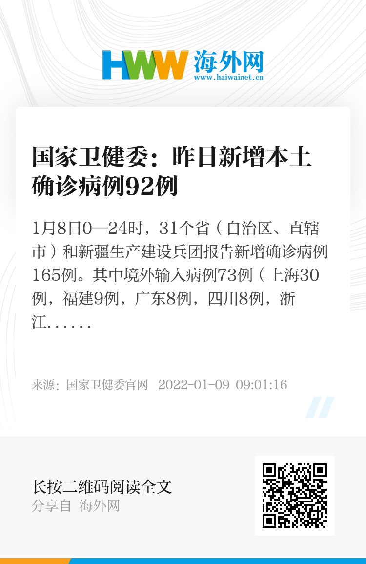 1月8日0—24时,31个省(自治区、直辖市)和新疆生产建设兵团报告新增确诊病例165例。其中境外输入病例73例(上海30例,福建9例,广东8例,四川8例,浙江7例,河南3例,广西3例,北京1例,天津1例,辽宁1例,山东1例,云南1例),含12例由无症状感染者转为确诊病例(浙江5例,河南3例,四川2例,辽宁1例,广东1例);本土病例92例(河南56例,其中许昌市39例、郑州市11例、洛阳市2例、安阳市2例、商丘市1例、滑县1例;陕西30例,均在西安市;天津3例,其中津南区2例、南开区1例;浙江2例,均在宁波市;广东1例,在深圳市),含3例由无症状感染者转为确诊病例(均在河南)。无新增死亡病例。新增疑似病例2例,均为境外输入病例(均在上海)。