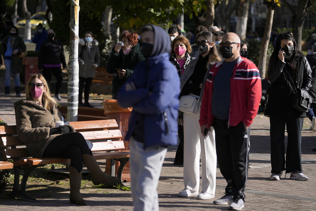 新冠疫情蔓延,希腊7日公布的日增确诊病例达近3万例,前总理安东尼斯·萨马拉斯也确诊感染。为遏制疫情,希腊政府正考虑将新冠疫苗强制接种的范围扩大到50至59岁的人群。图为当地时间1月3日,希腊雅典,民众等待新冠检测。图片来源:视觉中国